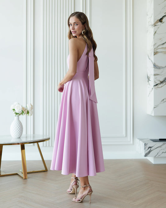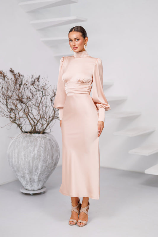 Dusty Pink Satin Turtleneck Puff-Sleeve Midi Dress
