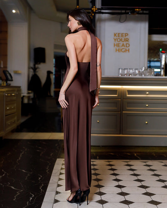 Brown Satin Turtleneck Puff-Sleeve Midi Dress
