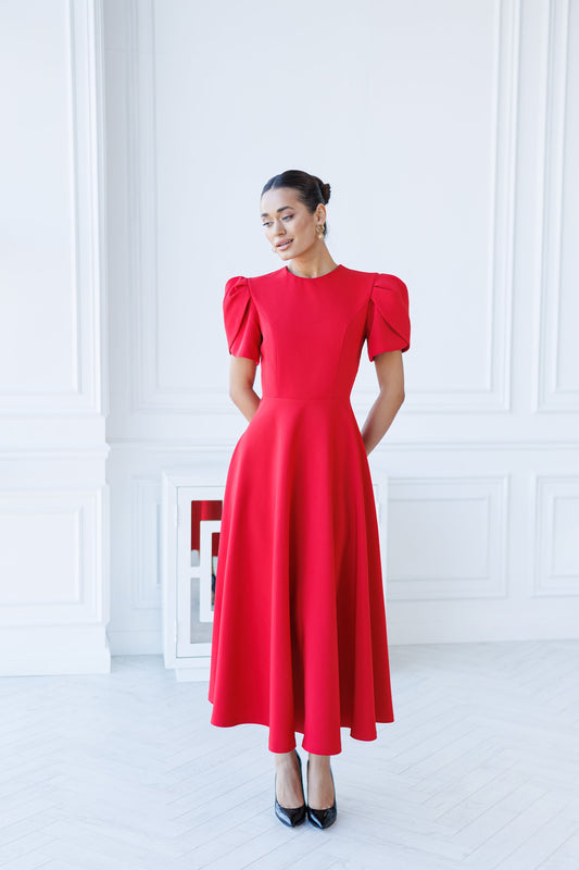 Alexa Red Round Neck Puff-Sleeve Midi Dress