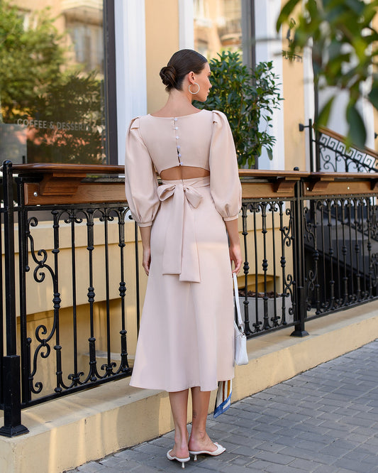 Beige Satin One-Shoulder Cut-Out Midi Dress