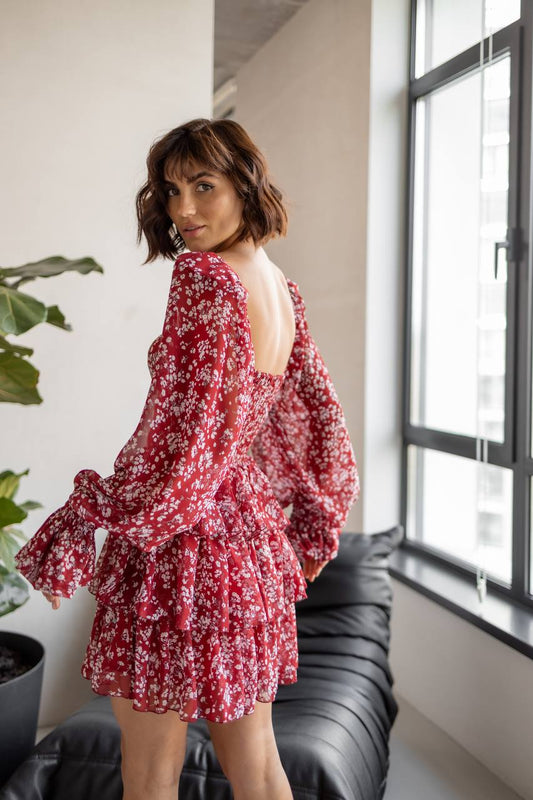 Burgundy Chiffon Mini Dress With Ruffles