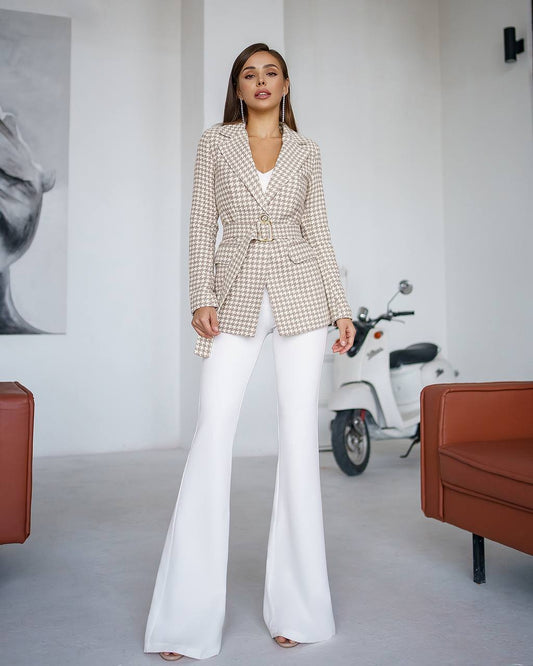 Beigefarbener Slim-Fit-Blazer mit Hahnentrittmuster und Gürtel