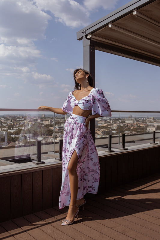 Purple Floral-Print Puff Sleeve Bow Top & Midi Skirt 2-Piece Set