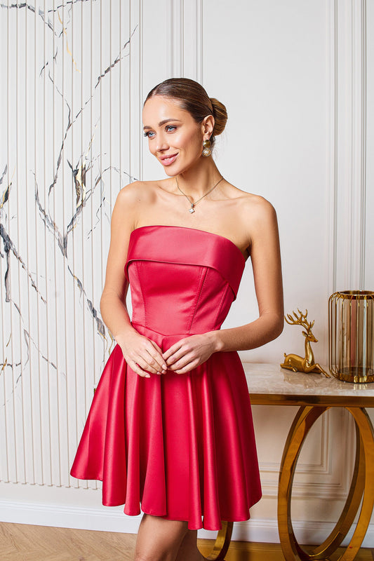 Red Satin Strapless Flared Mini Dress