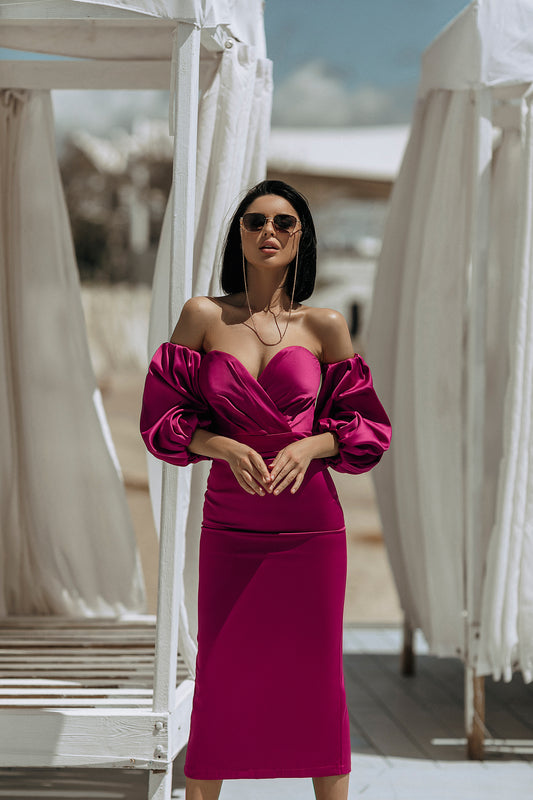 Fuchsia Midi-Ballkleid mit Puffärmeln