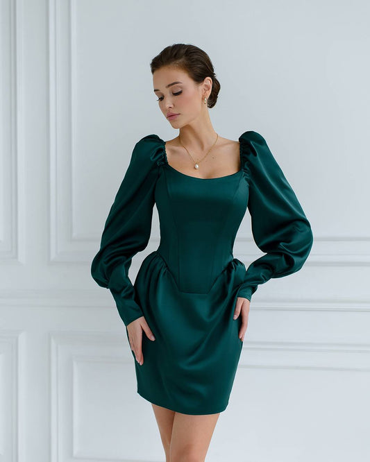 Smaragdgrünes Satin-Midikleid mit Puffärmeln