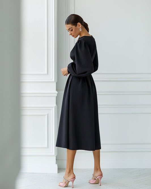 Schwarzes Midikleid mit V-Ausschnitt und Puffärmeln