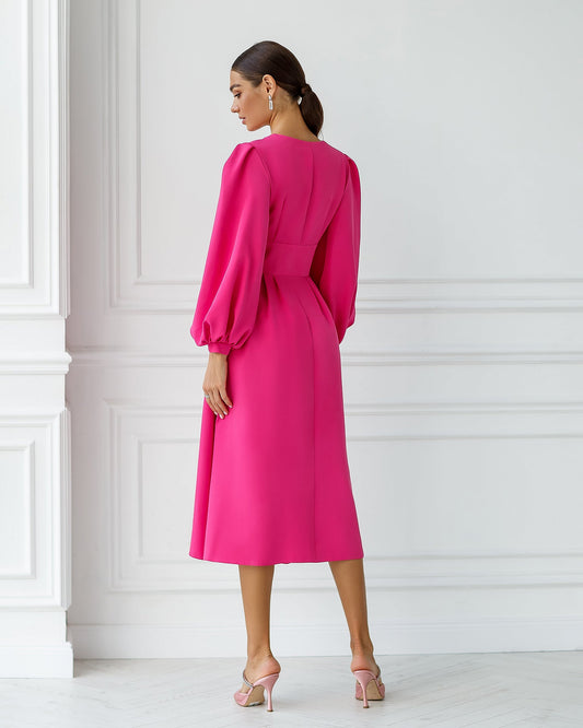 Purpurrotes Midikleid mit Puffärmeln und V-Ausschnitt
