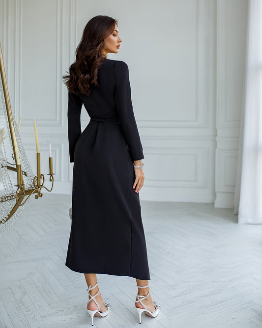Black Wrap Long Sleeve Collarless Maxi Dress