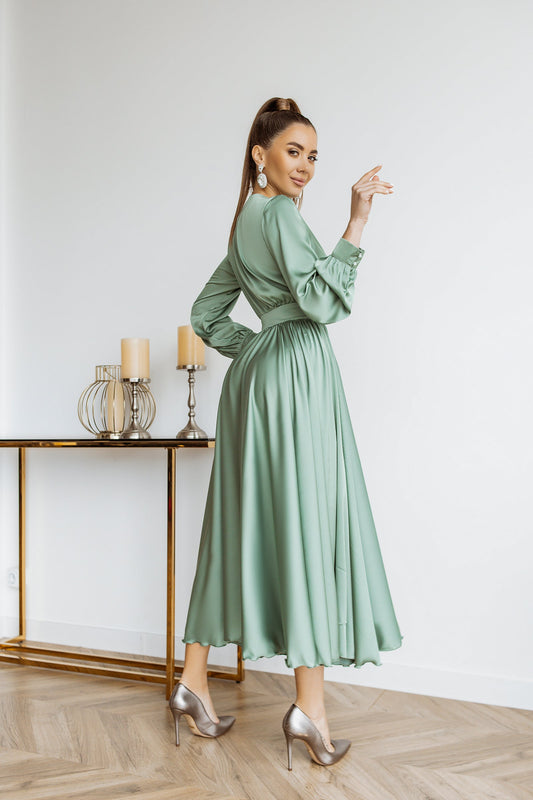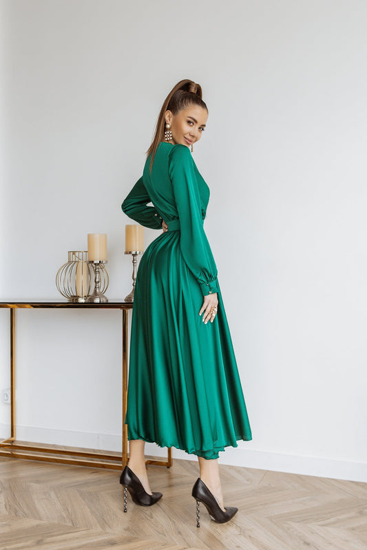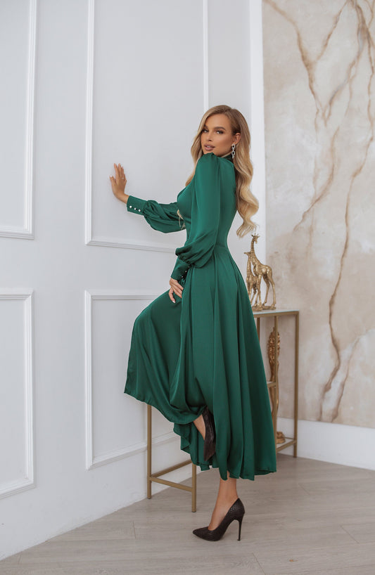Maxikleid aus smaragdgrüner Seide mit langen Ärmeln