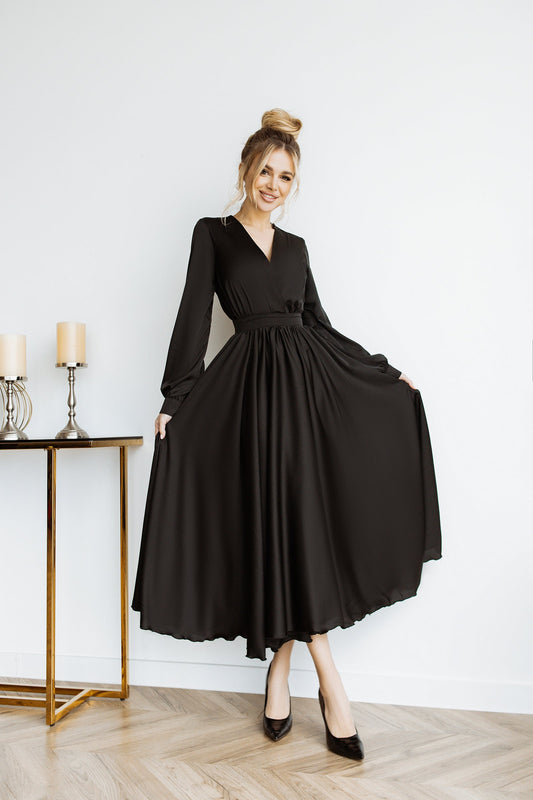 Black Silk Long Sleeve Maxi Dress