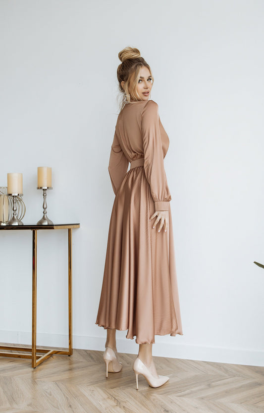 Beige Silk Long Sleeve Maxi Dress