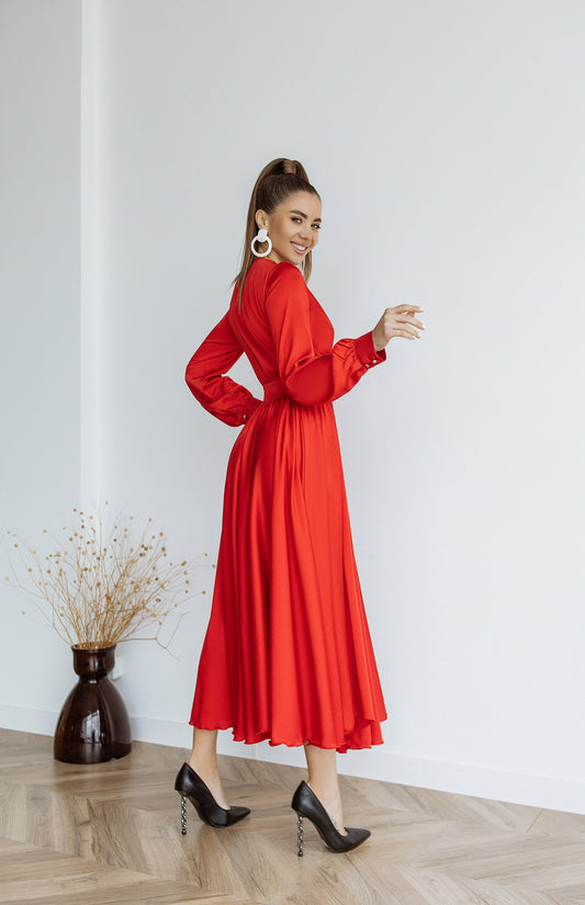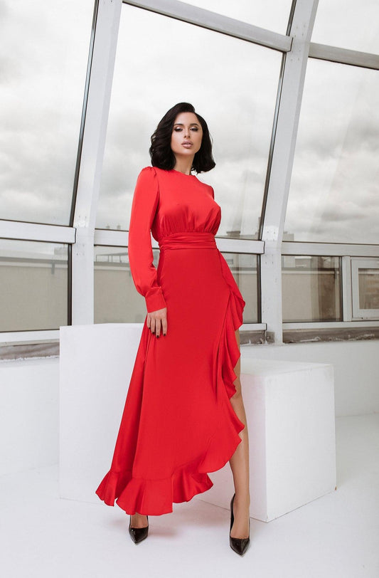 Red Silk Long Sleeve Maxi Dress