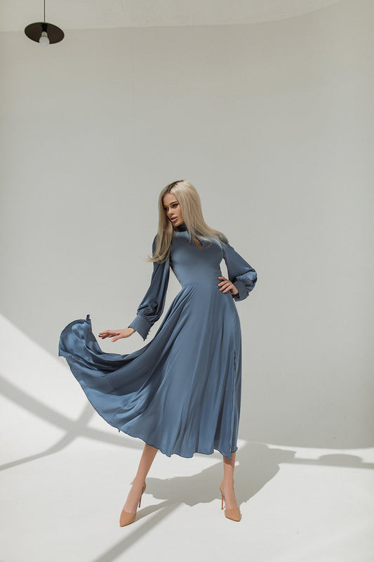 Maxikleid aus blauer Seide mit langen Ärmeln