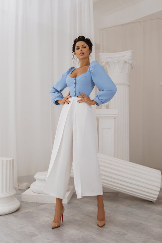 Himmelblaue Sweetheart-Bluse mit Puffärmeln