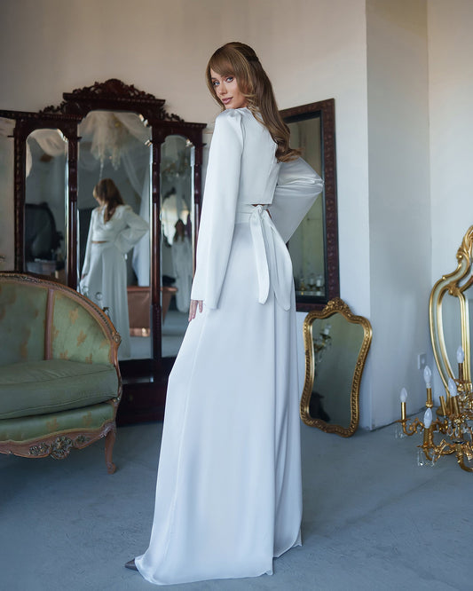 White Satin Bell-Sleeve Wrap Top & Wide-Leg Pants 2-Piece Set