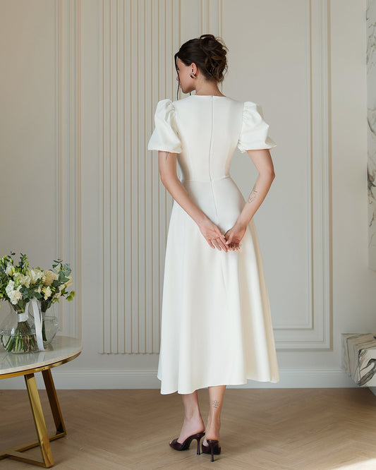 White Puff-Sleeve Midi Dress