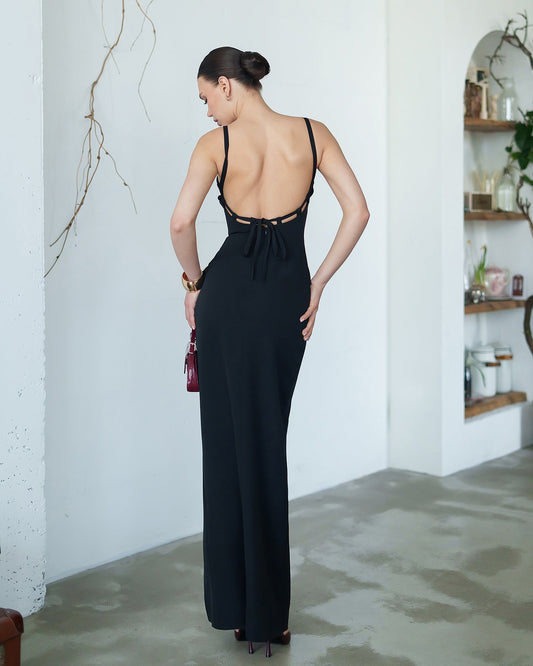 Éva Black Asymmetric Draped Open-Back Maxi Dress