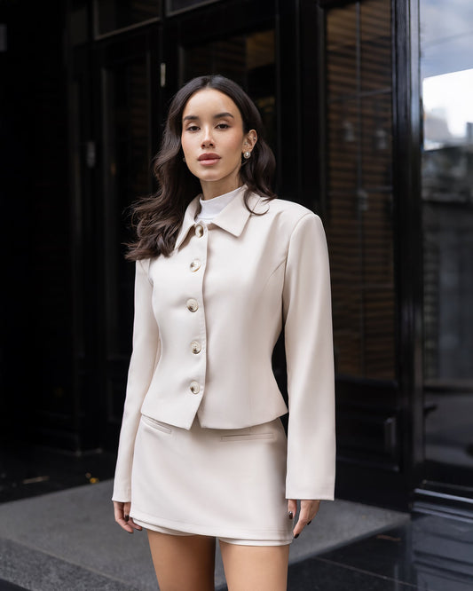 Elara Beige Cropped Button-Up Jacket & Mini Skirt Suit 2-Piece