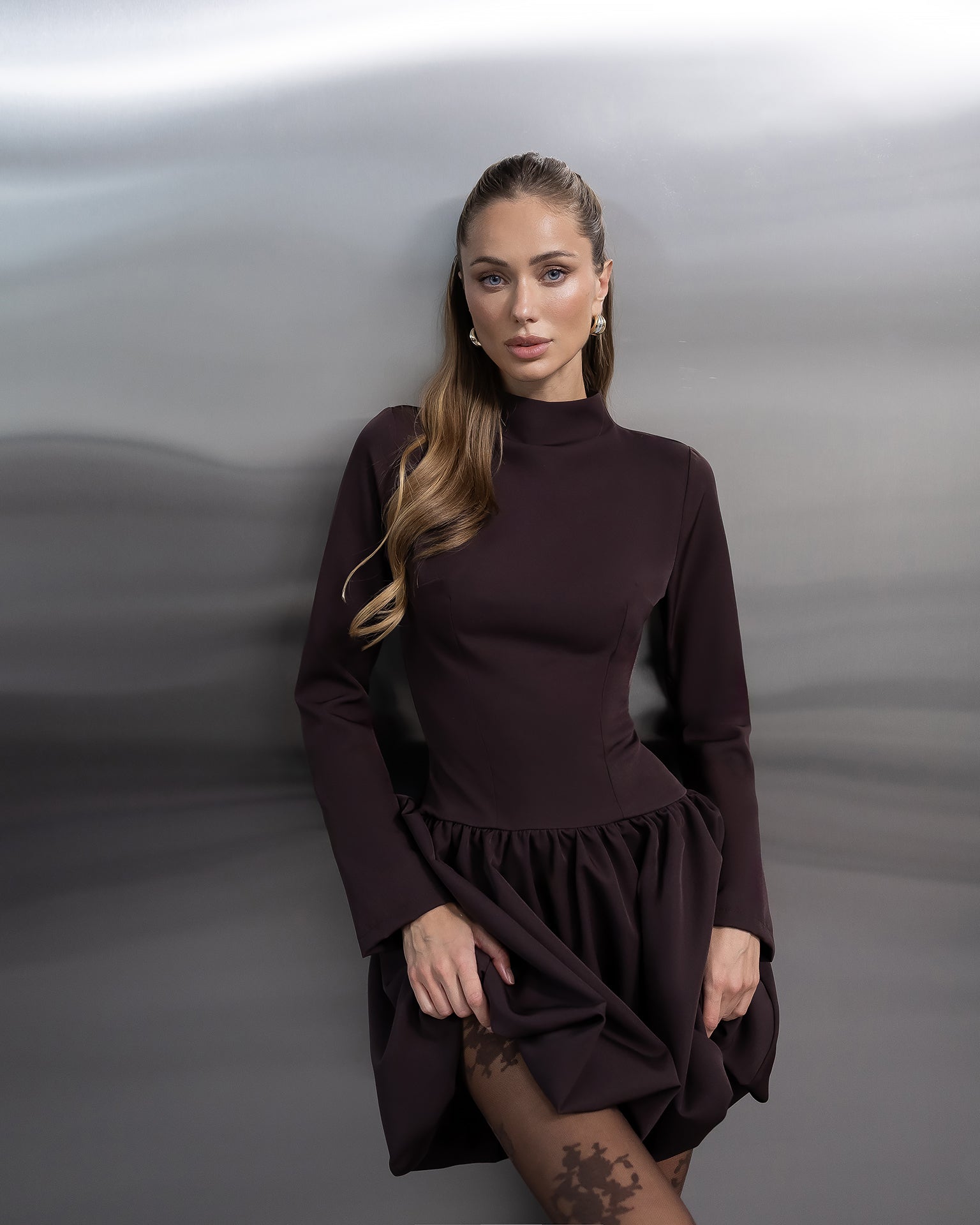 Elara Brown High-Neck Long-Sleeve Mini Dress