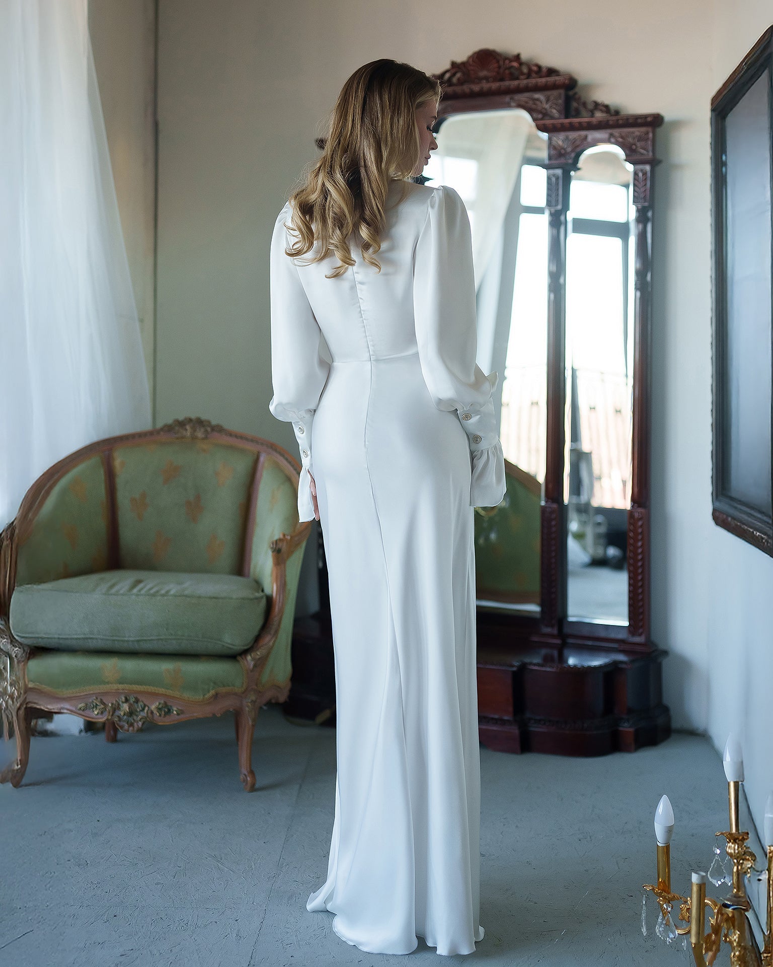 Gloria White Satin V-Neck Puff-Sleeve Maxi Dress