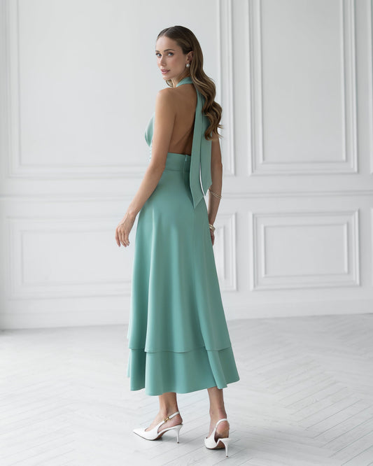 Gloria Olive Open-Back Halter-Neck Midi Dress
