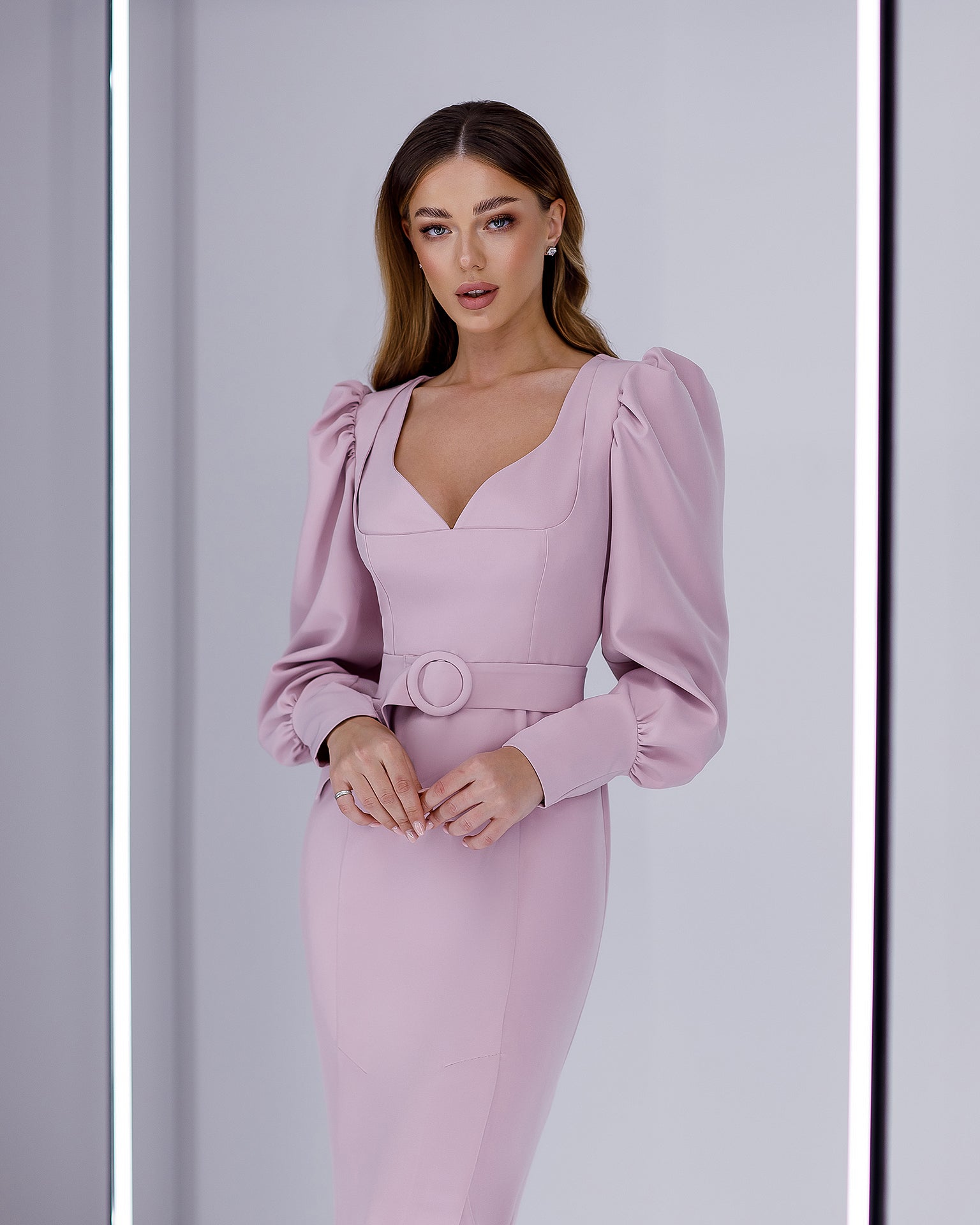 Dusty Pink Puff-Sleeve Belted Midi Dress