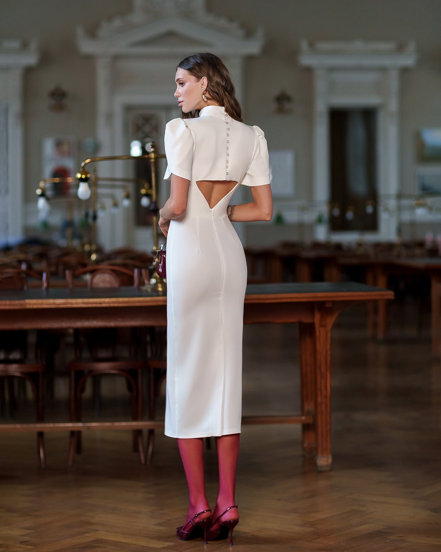 White High Neck Puff Sleeve Cut-Out Back Midi Dress