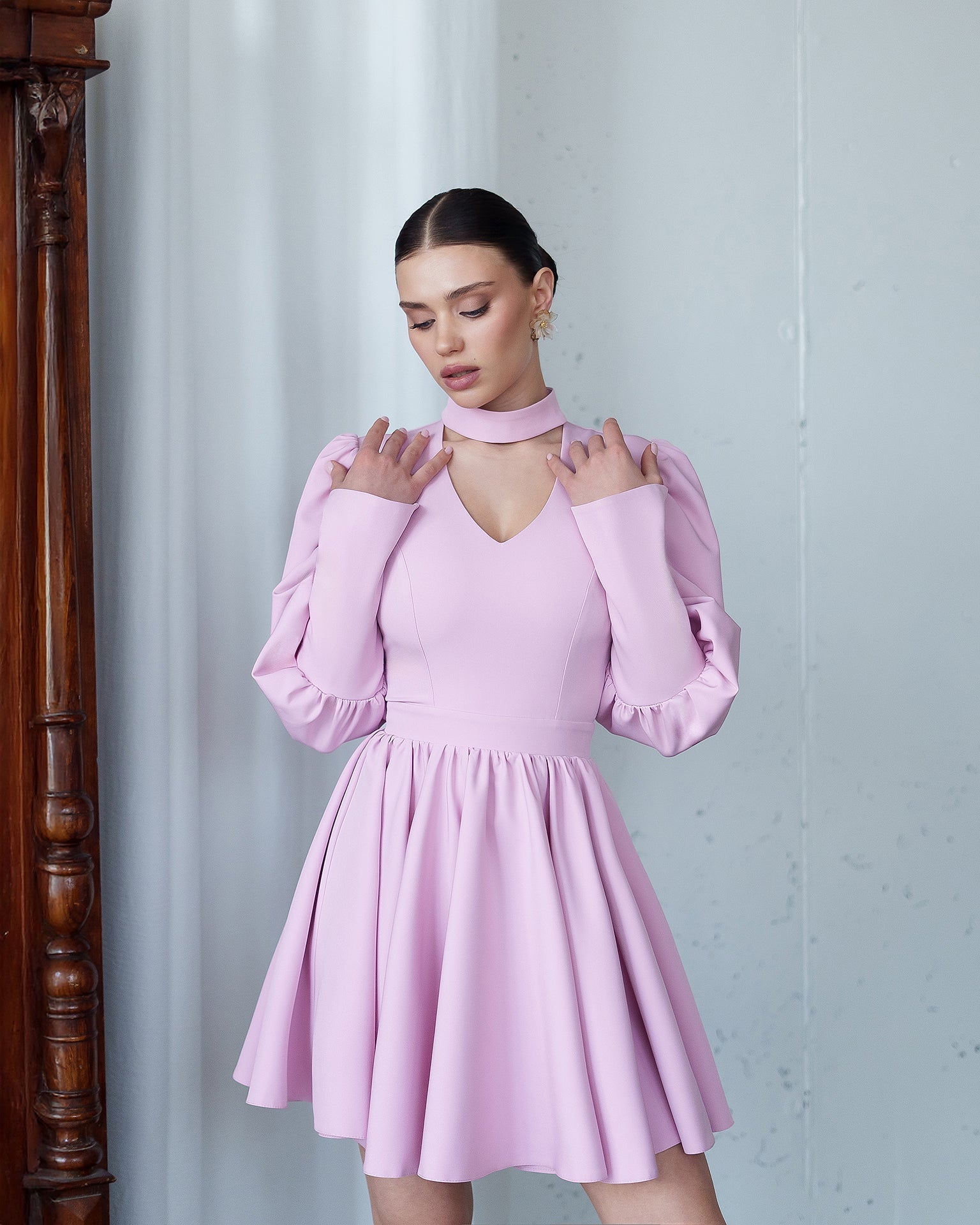 Bella Dusty-Pink Choker-Neck Puff Sleeve Mini Dress