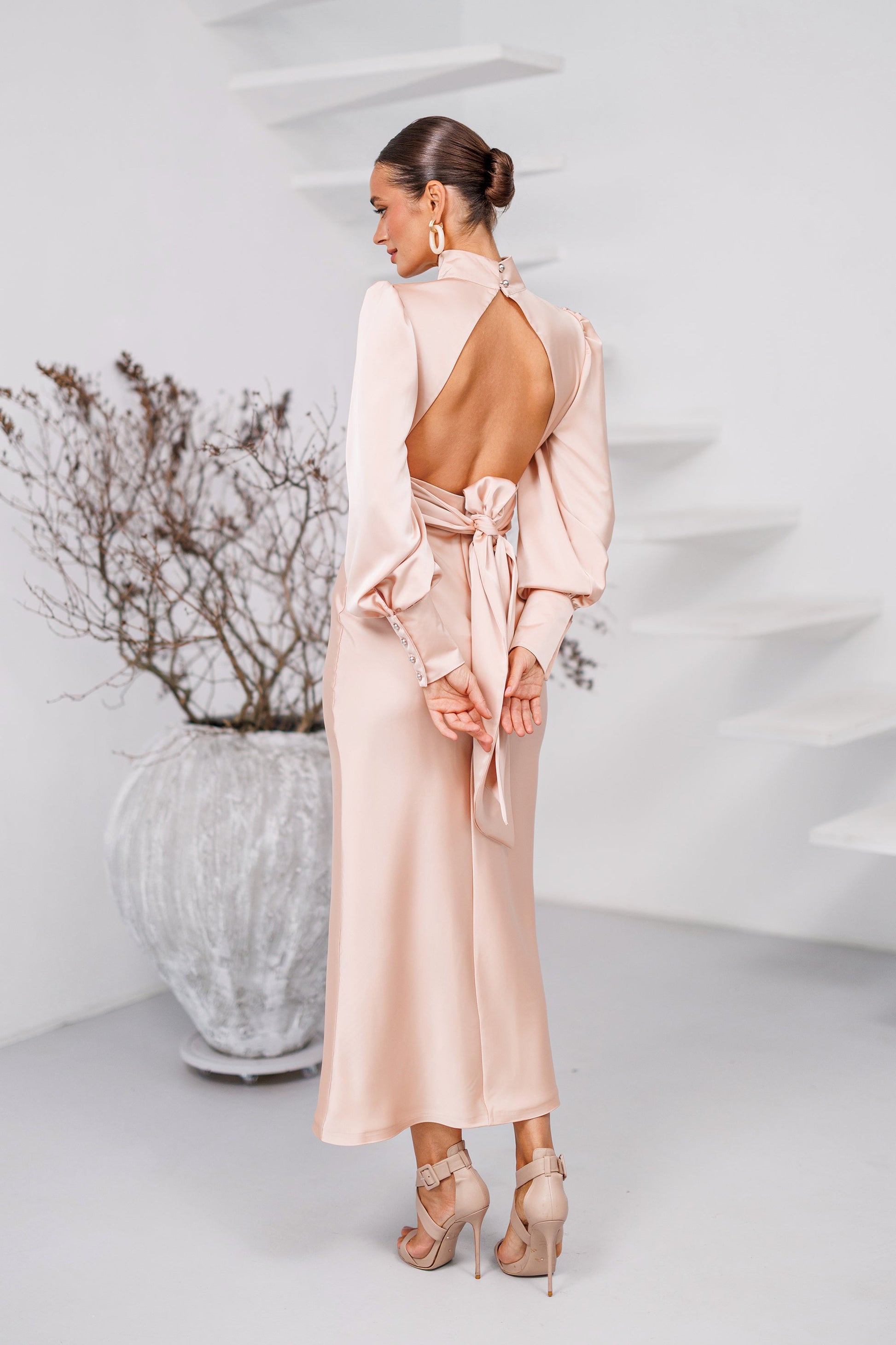 Dusty Pink Satin Turtleneck Puff-Sleeve Midi Dress